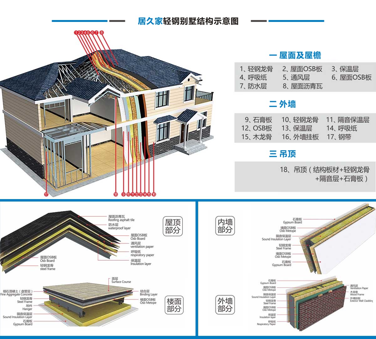 居久家輕鋼別墅自從業(yè)以來,一直秉承科學施工,嚴謹施工,安全施工的原則立足業(yè)內(nèi),公司始終以推廣和普及綠色、節(jié)能輕鋼結構建筑為己任,不斷積累經(jīng)驗,開拓創(chuàng)新。迄今為止,已完成上百套輕鋼別墅的修建,收到客戶的廣泛好評。